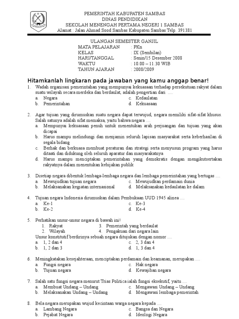 Negara memiliki kedaulatan ke dalam dimaksudkan untuk. Mengikuti pendapat teman c. Soal dan Kunci Jawaban UKK PKn Kelas 8 SMP Kurikulum 2006KTSP Tahun Pelajaran 20182019 Pelaksanaan UKK Ulangan Kenaikan Kelas mungkin sudah sedikit sekolah yang melaksanakannya pasalnya hampir semua sekolah kini sudah menggunakan kurikulum 2013.