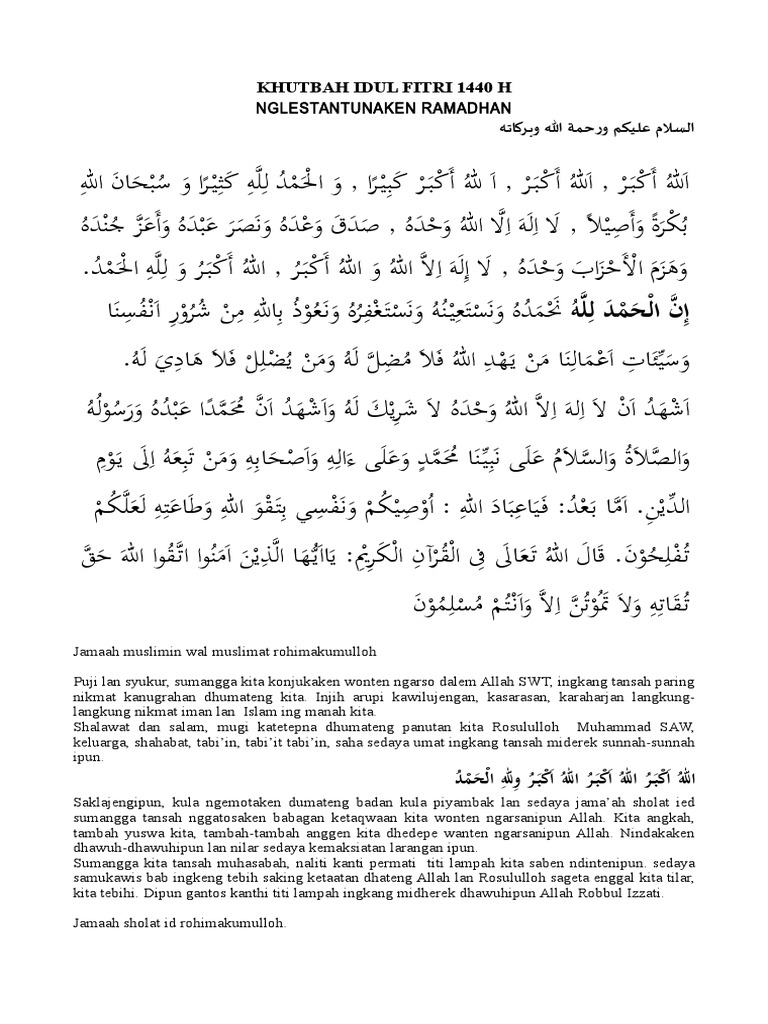 Doa kita semua mudah-mudahan puasa dan. Khutbah Idul Fitri Bahasa Jawa. Wekdal lebaran tanggal 1 Syawal 1441 Hijriyah shalat Idul Fitri boten kados taun-taun ingkang sampun kapengker lan mbok bilih ing sadanguning gesang nembe wonten ing taun.