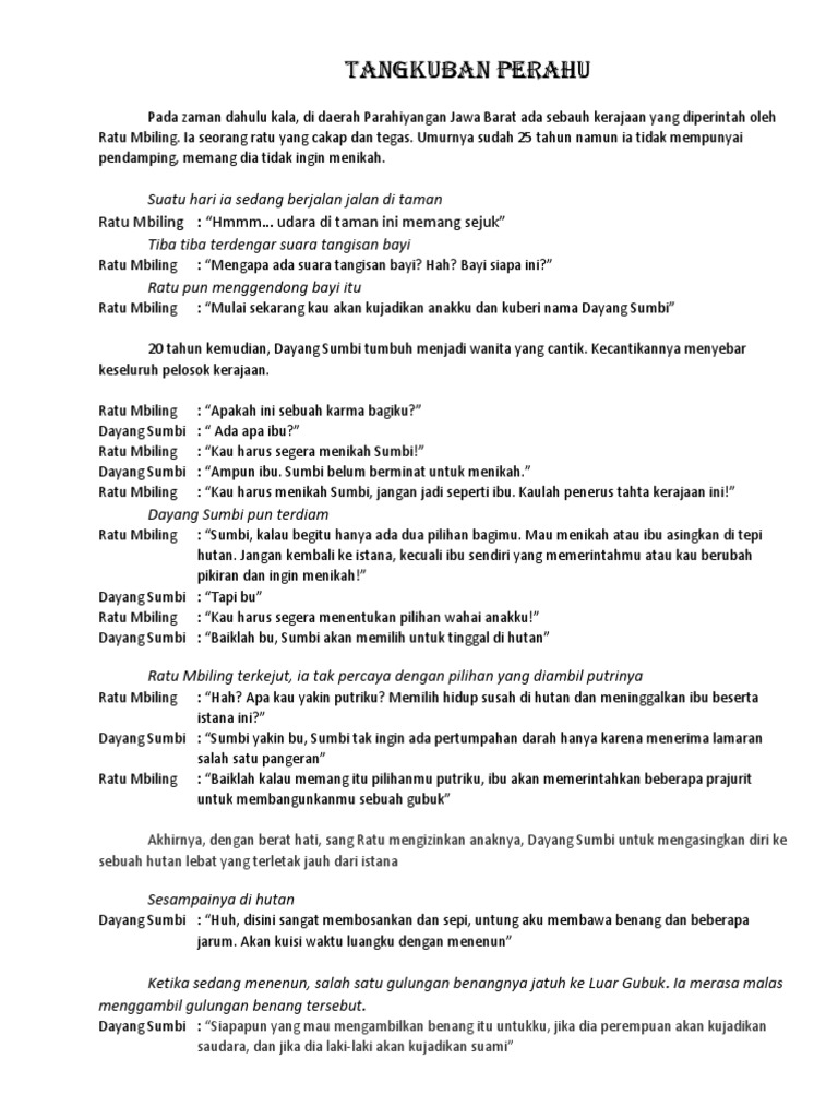 Naskah drama sangkuriang untuk 7 orang. Naskah Drama BATU MENANGIS untuk 7 orang LEGENDA BATU MENANGIS Kalimantan yang dulu disebut juga Borneo adalah salah satu pulau terbesar di nusantara dengan kekayaan alamnya yang menakjubkan serta hutan yang lebat dengan ratusan sungai yang berkelok-kelok telah memberi kehidupan bagi rakyat Kalimantan. Ia minta tolong Dayang Sumbi untuk merapikan ikat kepalanya. Seorang selirnya mempunyai sifat iri dengki dan ingin merebut kedudukan permaisuri.