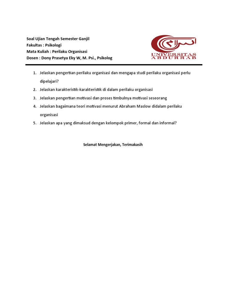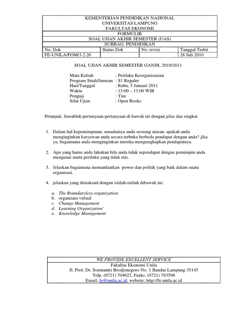 Soal Uas Perilaku Organisasi Ut. Prilaku Organisasi Dalam Pendidikan Dosen. Pada lembar pertama kertas jawaban anda tulislah.