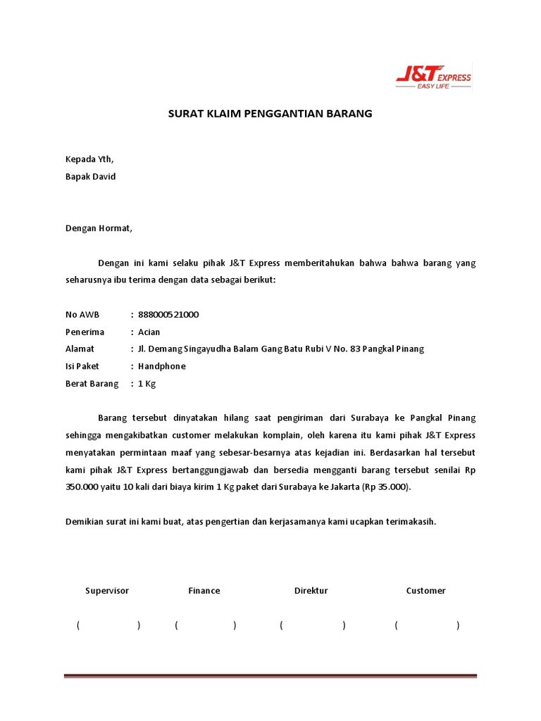 Contoh surat klaim ganti rugi JNE. Contoh Surat Klaim Contoh Surat Klaim Barang Contoh Surat Klaim Barang Rusak Download Contoh Surat Klaim Barang Rusak surat klaim. Maka ganti rugi yang diberikan bukan Rp.