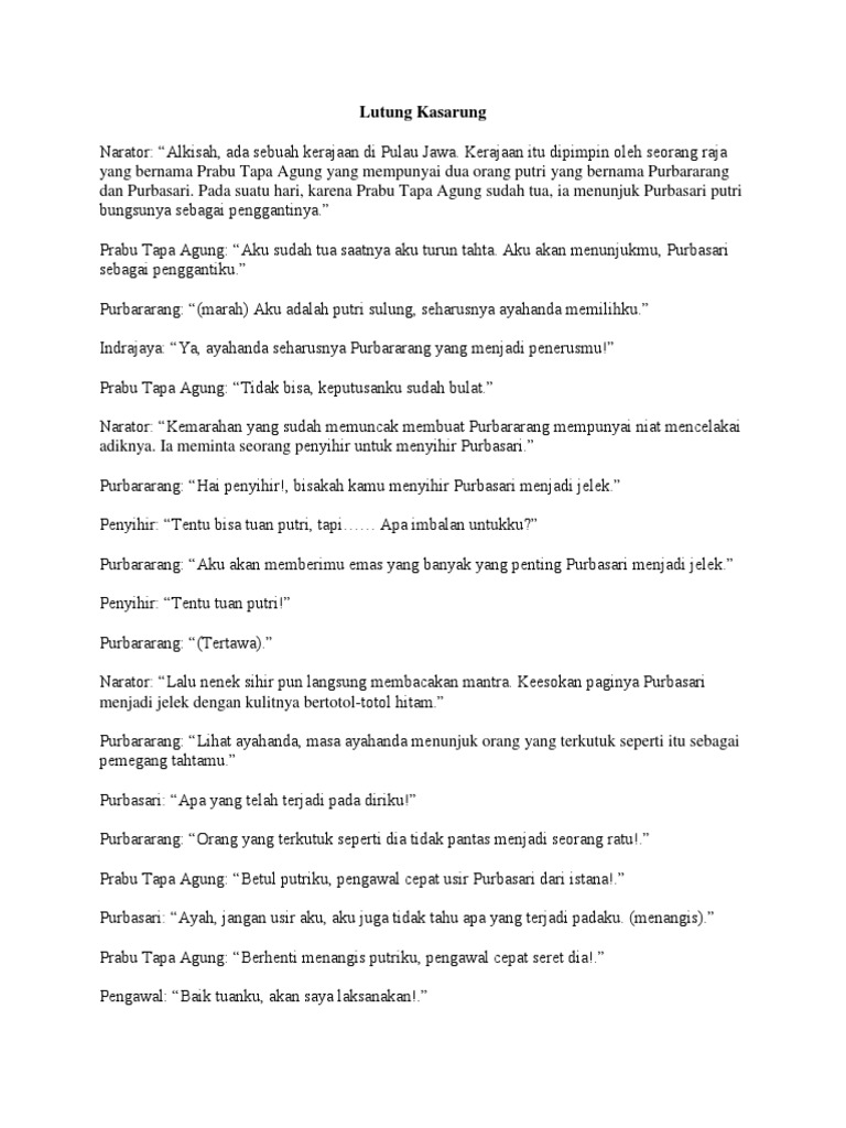 Cerita Rakyat Lutung Kasarung Lutung Kasarung yang artinya Lutung yang Tersesat adalah cerita rakyat yang mengisahkan legenda masyarakat Sunda tentang perjalanan Sanghyang Guruminda dari Kahyangan yang diturunkan ke Buana Panca Tengah Bumi dalam wujud seekor lutung sejenis monyet. Naskah drama keong mas. Lutung kasarung selalu menggembirakan Purbasari dengan mengambilkan bunga bunga yang indah serta buah-buahan bersama teman-temannya.