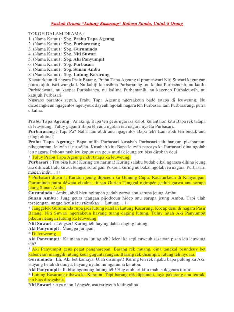 Naskah Drama Lutung Kasarung Bahasa Sunda Untuk 8 Orang. Tentu ini bukanlah hal yang sangat mudah apalagi untuk 8 orang dan harus dituliskan kedalam bentuk bahasa sunda. Tuluy ngajurungan Paman Léngsér nitah Aki Panyumpit ngala lutung.