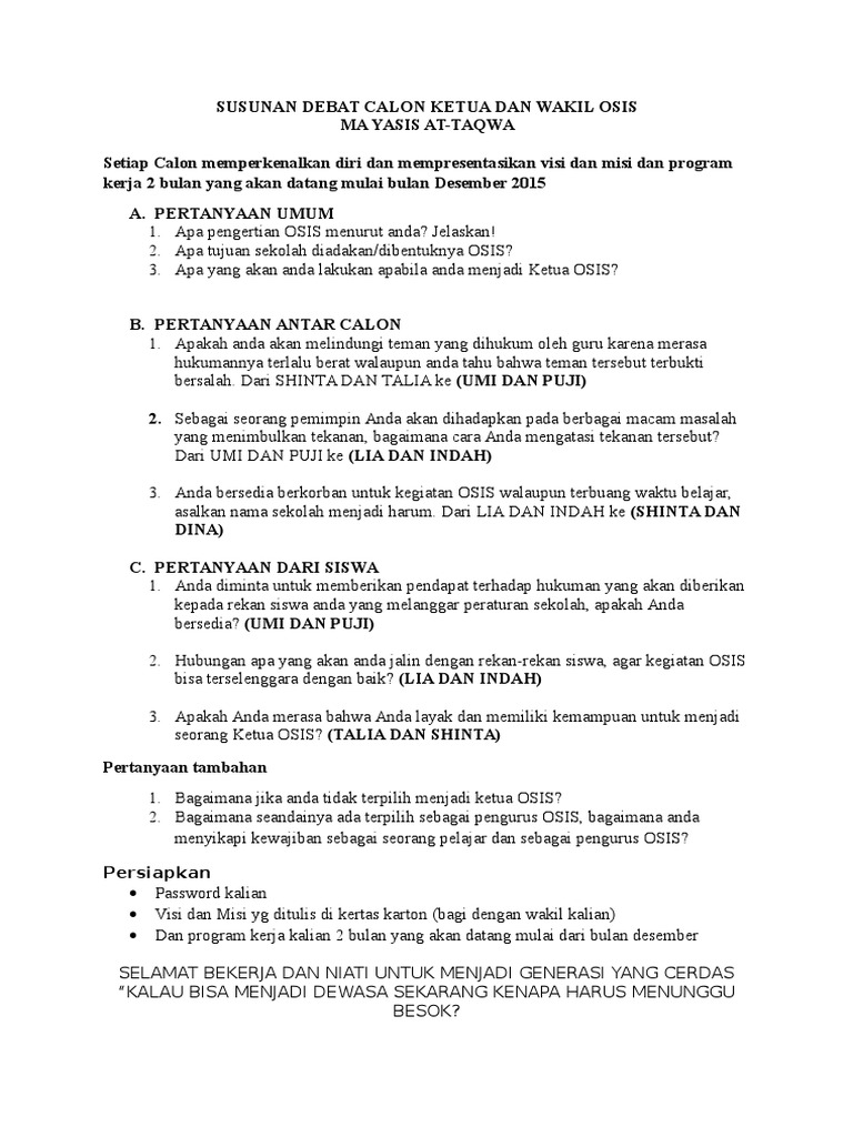 Contoh Pertanyaan Dalam Debat Calon Ketua OSIS pertanyaan menjebak untuk calon ketua osis 23 07 2019 Contoh Pertanyaan Dalam Debat Calon Ketua OSIS 1 Jika Anda terpilih menjadi Ketua OSIS apa yang akan Anda lakukan jika Anda berhadapan dengan murid yang keras kepala 2 Program apa yang akan Anda bangun untuk memajukan OSIS di sekolah Anda 3 Sebagai seorang. Sebutkan kritik dan saran untuk osis masa bhakti 201 4 201 5. Berikut daftar pertanyaan untuk calon Ketua OSIS.